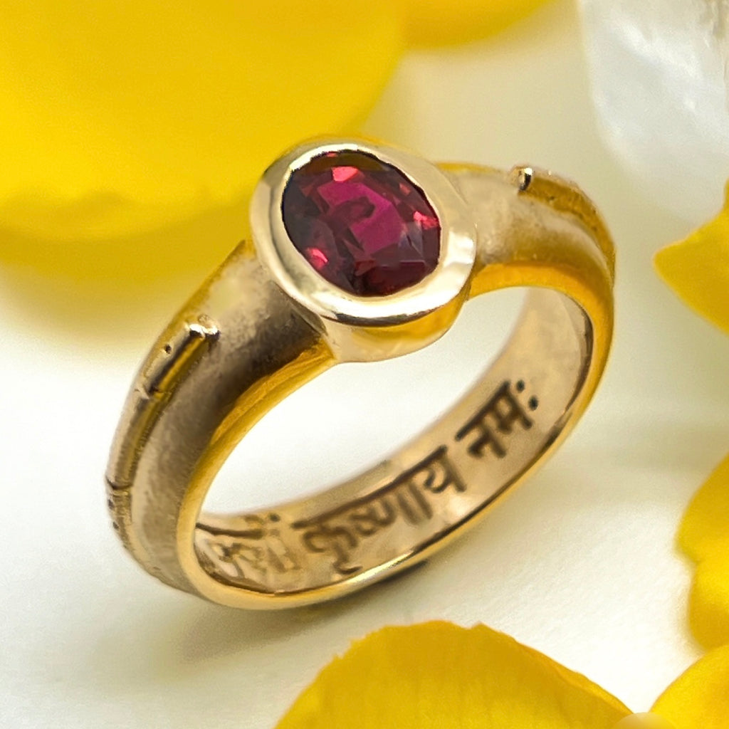 Accented with Krishna's flute and mantra, this one-of-a-kind 18k gold ring is set with an untreated ruby of the finest quality. Ruby is the primary gemstone of Sūrya (the sun) and depending upon the client the preferable hue can range from deep red to vibrant pink. The most supportive color is chosen according to our client’s unique life path and their position in society.