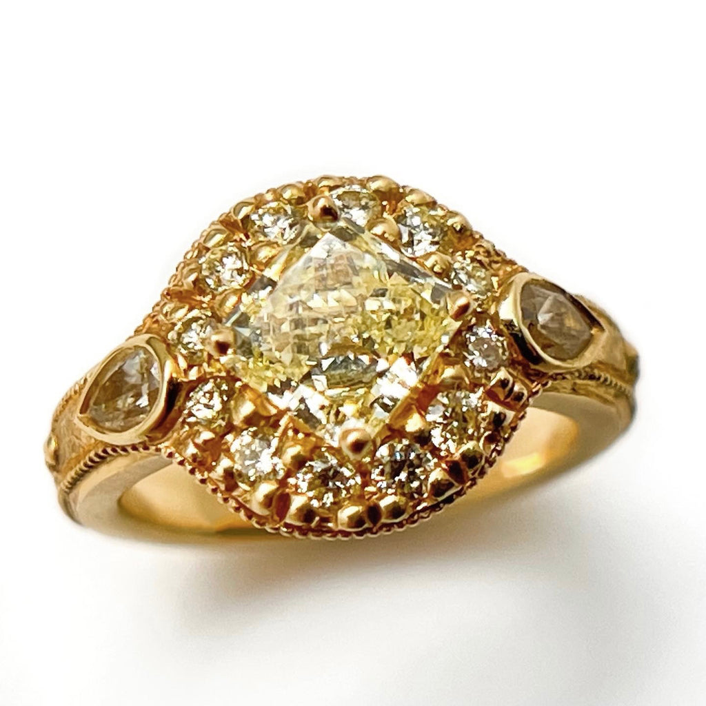 The custom 18k yellow gold engagement ring features fifteen brilliant, natural yellow diamonds. The band is accented with fine milgrain and the Chandrabindu, which symbolizes the union of Shakti and Shiva.